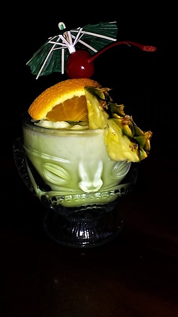 Finally, dinner time rolled around again. I pushed for pizza from the tiki bar. We phoned it in and I went to pick it up. It wasn't ready (of course), so I had a cocktail while I waited (a Green Spark. Eh...).