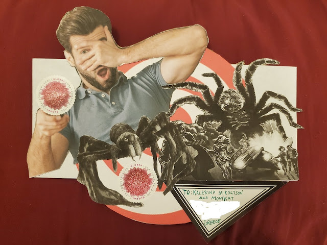 Inside was an oddly written note as well as some artists postcards. I owe him something now as well. He did say that "Zombie Proctologists", which was the piece I had sent him originally, "was praps the most wonderful I've ever received. No shit."