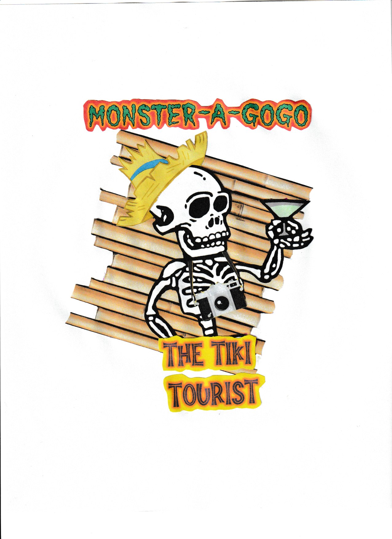 Monster-A-GoGo: The Tiki Tourist. I used the avatar that I use everywhere...and just tiki-fied it with the hat and added a camera for the tourist aspect. I printed, cut, pasted and then scanned. It came out okay...