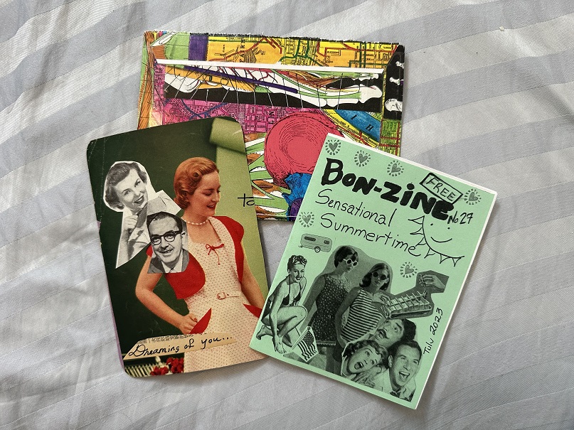 In addition to a groovy envelope, I got an art card of hers with a note on the back...and (WHOO_HOO!) one of her Bon-Zines! Thank you!!!!